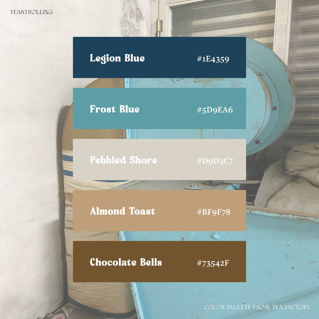 後來在整理色票時,發現茶廠環境的顏色也和這些藍綠互相呼應,拼湊出意外和諧的氛圍~於是我先用 Adobe Color 挑出五種主要色彩(網頁會自動選取,也能再自行微調)然後把 HEX 色碼複製到 iColorpalette。這個網站會為每個色碼挑出最接近的顏色,並且賦予一個專屬的名稱。這些名稱多半取材自大自然的意象,也讓顏色不只是色碼,而讓人更能想像及感受~